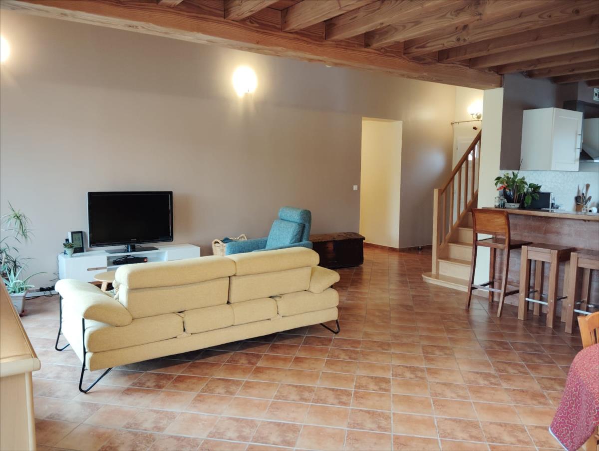 Elle possède de plain pied une vaste pièce de vie de plus de 40 m² ouverte sur la cuisine aménagée et équipée, ainsi qu'une arrière cuisine.